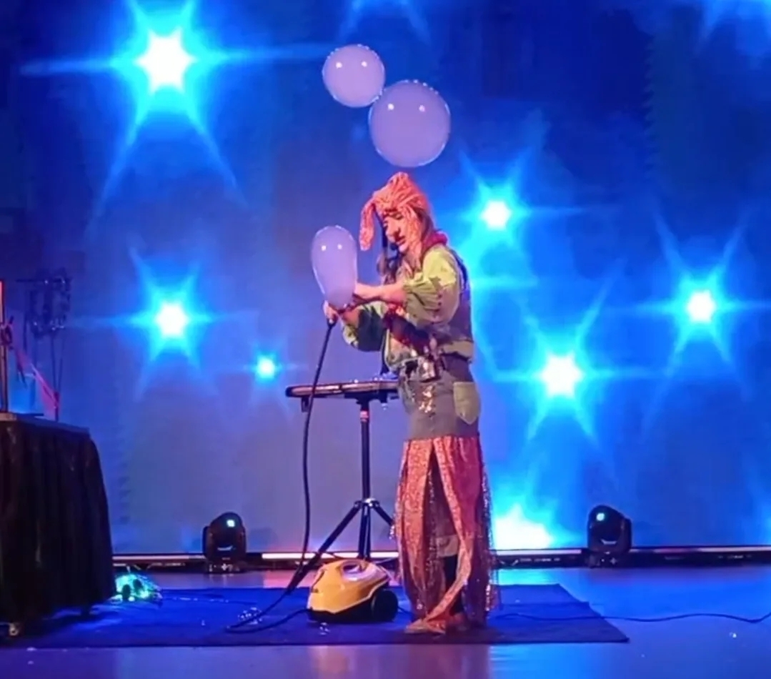 Не обошлось и без современной Бабы Яги, мечтающей стать цирковой артисткой. Она устроила шоу больших шаров и гигантской подушки, дрессировала мыльные пузыри, показала огненные и дымные трюки.